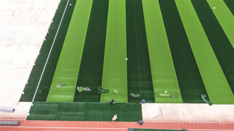 石狮市第八实验小学二期工程又有新进展。记者日前在施工现场看到,施工人员正在为足球场铺装人工草坪,完工后将为八小师生体育活动提供更优质的环境。(记者 兰良增 颜华杰)