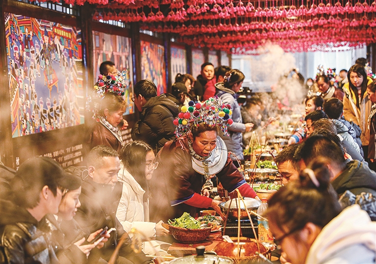 1月28日,在三江侗族自治县程阳八寨景区,游客在体验侗族百家宴。年关临近,广西柳州市三江侗族自治县程阳八寨、布央茶园等侗寨和景区的群众和工作人员积极排练节目。春节期间,他们将向八方游客展示侗族大歌、多耶舞、琵琶歌等非遗文化。近年来,三江侗族自治县大力发展文旅融合产业,推进旅游产业转型升级,助力乡村振兴。2023年,该县接待游客901万人次,实现旅游消费收入96亿元。(新华)