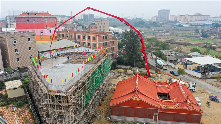 本报讯 1月30日中午,随着最后一车混凝土的浇筑,蚶江镇东垵村老人居家养老活动中心与敬老院项目主体工程顺利封顶。这是东垵村村民尤其是老年人期盼10多年的一件大事,也是东垵村众志成城,团结友爱的一个见证。