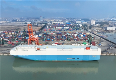 1月30日拍摄的停靠福州港江阴港区装运出口海外乘用车的远洋滚装船(无人机照片)。近年来,福建港口不断提升港口设施和服务,福州港和厦门港成为汽车滚装出口的重要通道。据统计,2023年福建省汽车出口8.9万辆,海外市场覆盖151个国家和地区。外贸“新三样”之一的电动载人汽车全年出口2.6万辆。(新华)