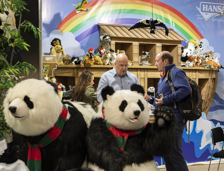 1月30日,在2024德国纽伦堡国际玩具展上,人们在一个摆放着熊猫玩偶的展位交谈。2024德国纽伦堡国际玩具展1月30日拉开帷幕。本届展会将持续至2月3日,共有2100余家展商前来参展。(新华)