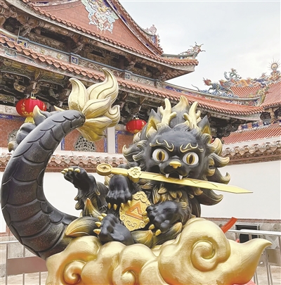 在中国传统文化中,龙是吉祥神宠之一,能行云布雨、消灾降福,代表着尊贵和神圣的意义,经常会作为装饰物出现在建筑中,此次以《山海经》记载的龙生九子为灵感,设计创作出形态各异、特点鲜明的龙系列形象,表达了人们祈愿平安的美好愿望,而且每条龙子都有其独有的个性及神通,创作团队就将其与古城里对应的九个点位特色相结合,同时还配上一句闽南话祝语,最后呈现的作品就很泉州、很地道。比如,龙四子蒲牢喜欢盘旋于洪钟之上,就让它盘旋在西街钟楼上,手捧龙珠,目光如炬,匹配的闽南话祝语:“龙众起大厝”,寓意大家都能盖起大房子、家业兴旺。龙五子狻猊喜欢闻香沐烟,就把它与泉州香火鼎盛的关帝庙相结合,配上的祝福语是“龙众趁大钱”,意为新的一年赚大钱发大财……