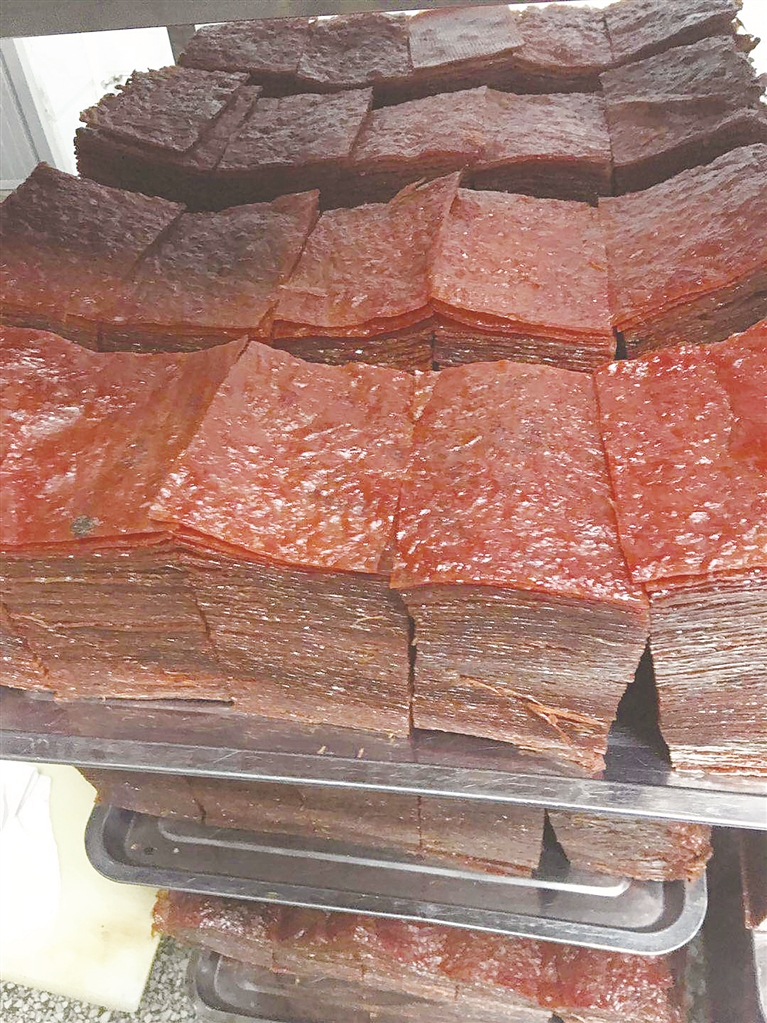 了解得知,肉脯原材料主要取自猪、牛的后腿,经分割、去膘、去骨膜等一系列工序后,冷冻切片,与传统配料一起放入搅拌机中搅拌。腌制24小时后,把腌制好的肉片进行烘烤,将烤干的肉脯放入隧道炉中以240℃左右的高温再次烘烤,确保每一片肉脯烤出来的时候都起油泡,色泽光鲜亮丽,香气扑鼻。