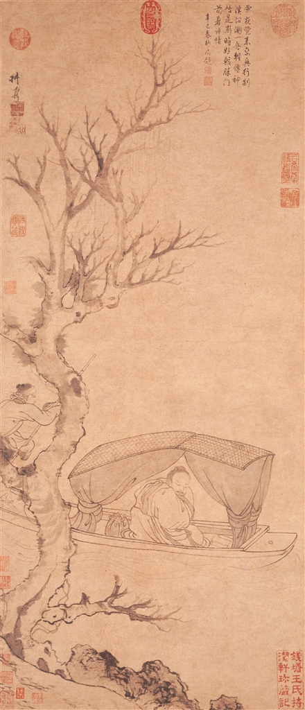 张渥(?—约1356年),元代画家,字叔厚,号贞期生、江海客,祖籍淮南,后为杭州人。博学多艺,累考科举不中,遂致力于诗画。善画人物,学李公麟白描,也有人说他学南宋梁楷,笔法细劲,形象生动。《雪夜访戴图》,立轴,纵91.1、横39.3厘米,纸本设色。《雪夜访戴图》是一幅山水、人物相结合的佳构。作品对雪溪(剡溪)具体环境的描写着力较少,而侧重于写王徽之坐于船中的神情,表现隐逸之士的高洁品德与情怀。只见,画幅下端为山石河岸,岩石横列,坡岸有一棵树拔地而起,枝干粗壮,曲直向上,树上长满疤结,树叶已凋落,呈现出一派严冬气象。画幅近中间部位,画有扁舟,船舟上搭有宽敞船篷,孤舟一叶行进在溪流中。船窗内端坐一位高士:王徽之,双手拢袖,在船舱内读书,双目凝神,专心致志。船尾的船夫以袖裹篙正在使劲撑着船篙。该图人物造型准确,虽仅寥寥数笔,却将人物刻画得惟妙惟肖。在构图上作者采用近景构图,着重突出正行驶的舟楫,画面有意侧重写出主人翁双手拢袖,一株脱尽树叶的寒木,船夫畏寒瑟缩等,以衬托出雪夜寒意的情景。此图曾经清人潘延龄、宫子行、何瑗玉和乾隆内府以及近人庞元济收藏。图上有清高宗弘历题诗:“雪夜觉来乘兴行,剡溪沿溯一舟轻。传神恰是斯时好,较胜门前著语情。”图上署款“叔厚”,下钤“叔厚”白文方印、“游心艺圃”朱文方印。
