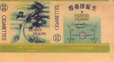 位居“四灵”之首的龙,是中国民间神话中能起到驱邪、避灾、祈福作用的经典物种。中国华鼎烟草公司出品于20世纪30年代的“天龙牌”烟标(图1),副版以一条在乌云翻滚云层中给人间普降甘霖的黑龙,说明行云布雨是龙的主要职责所在。传说中腾云驾雾、翻江倒海的神龙,更是以其见首不见尾的形象,时不时地飞进烟标这方平台,向国人诉说龙族的前世今生。如李义兰烟庄出品于20世纪40年代的“黄龙”烟标(图2),游动着14条腾飞的黄龙。黄龙又名应龙、飞龙,据《述异记》载:“蛟千年化为龙,龙五百年为角龙,又千年为应龙。”广西横县卷烟厂出品于20世纪70年代的玉龙烟标(图3),主副版采用腾飞于祥云中嬉戏火珠的彩龙,向国人传递出这样一种信息:虽然龙集许多物种于一身,然而它的颜值也是一流的。湖南永顺卷烟厂出品于20世纪80年代的“神龙”烟标(图4),主副版飞跃着一条颜值一流的彩龙。