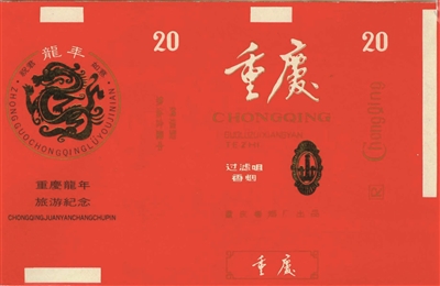 龙也时常以形态各异的生肖形象,不时给国人送上喜迎龙年的新春祝福。如湖北郧阳卷烟厂出品于20世纪80年代的“云龙”烟标(图9),主版于祥云中嬉戏的腾龙两旁分别印有“龙年大吉”“恭喜发财”字样。重庆卷烟厂出品于同期的“重庆”烟标(图10),副版是一条环以“祝君龙年如意”的金龙腾飞环宇的镜头。湖北恩施卷烟厂出品于此后90年代的“龙年”烟标(图11),主版为传统的儿童与游龙嬉戏年画;四川泸州卷烟厂出品于同期的“龙年大吉”烟标(图12),主版以一条回首张望的金黄色腾龙画面,营造出民众喜迎龙年的祥和气氛。