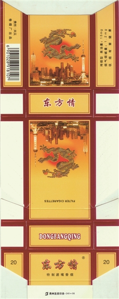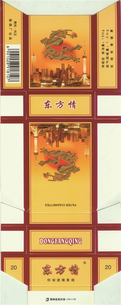 龙是中华民族的象征和图腾,国人自古都以自己是“龙的传人”而骄傲与自豪。有鉴于此,国产烟草企业曾于20世纪90年代出品过许多熔铸有中国精神图腾的烟标。如江西井冈山卷烟厂出品的“东方龙”烟标(图5),主副版呈现出一条黄龙团游动于黄河上空,在其左上部印有“龙的传人”字样。贵州贵定卷烟厂出品的“华夏”烟标(图6),一条团龙在代表我国长江、长城、黄山、黄河上空尽情腾飞的同时,在其右边,还印有不同形体的“龙”字书法手迹。贵州兴义卷烟厂出品的“东方情”烟标(图7),主副版均是在朝霞映红东方之际,一条金黄巨龙,正在以黄浦江畔、东方明珠塔等著名景观为中心的上海这座现代化都市上空尽情遨游。广西中烟工业有限责任公司出品的“真龙·海韵”烟标(图8),主版于中国南海版图衬托下,映现出一条神龙在南海巡游,同时于金色南海龙王神像下面,印有“积运祈福,润泽大地,泰和祥瑞,四海升平”字样。由于这些烟标蕴含中华儿女是龙的传人、龙是中华民族的图腾民魂的深刻含义,因而这些烟标已经不仅仅是香烟的品牌,它们更为深切地充满了对祖国的热爱之情。