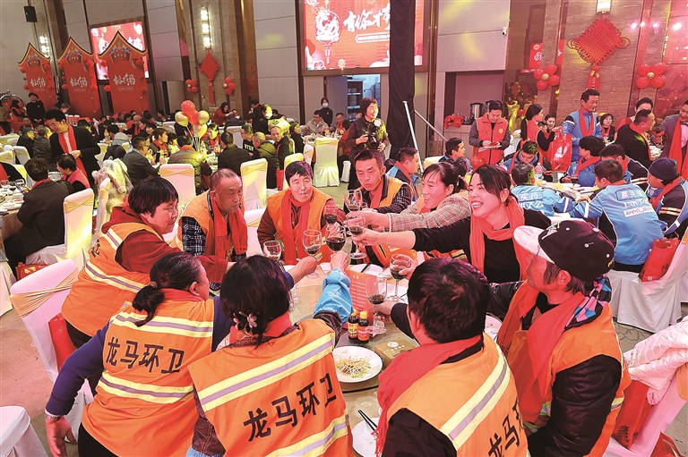 现场,领导嘉宾们与宁夏来石挂职人员、我市赴宁夏挂职人员、石狮2023年获评劳模(工匠)代表、新就业形态劳动者、环卫工人、留石过年企业职工、阳光太太、暖心驿站志愿者代表等共叙温情、共享美食。在欢声笑语中,大家聊家常话来年,送祝福鼓士气。“给大家拜个早年,祝大家身体健康,阖家幸福,干杯!”当一桌桌香气四溢、极具石狮风味的年夜饭被送到饭桌上,大家共同举杯,庆祝新的一年。台上《有你才有福》情景朗诵、《相亲相爱》大合唱等精彩演出轮番上阵,不时赢得职工的阵阵掌声,大家的脸上都洋溢着节日的幸福微笑。