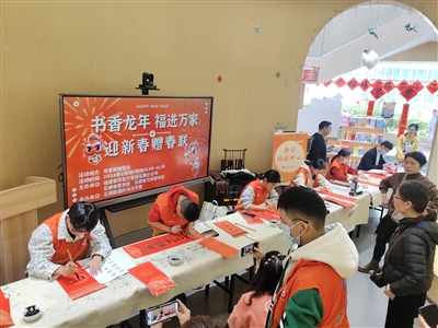 本报讯 挥笔书写中国“福”,欢声笑语迎佳节。2月1日下午,由市新华书店、市图书馆(文林图书馆)、万祥图书馆、石狮鹤翥轩书法学堂联合主办的“书香龙年·福进万家”迎春送福活动,在书香狮城驿站举行。