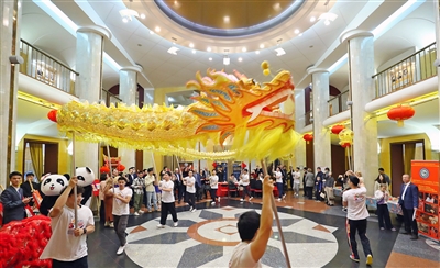 1月26日,在白俄罗斯首都明斯克,演员在白俄罗斯国家音乐厅的剧院回廊表演舞龙。 白俄罗斯“欢乐春节”《古籍里的古曲》新春民族音乐会1月26日晚在白俄罗斯国家音乐厅举办,白俄罗斯各界代表和在白华侨、中资企业、留学生代表等600余人出席。(新华)