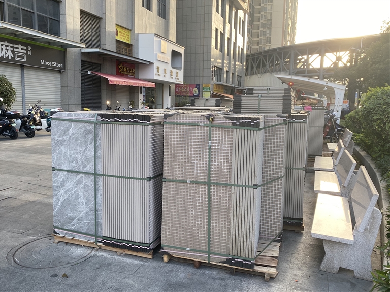 近日,笔者在聚仁路看到,供路人休息的石椅前堆放着一些建筑材料,让这些石椅成了摆设。