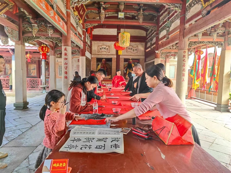 在春节临近之际,村里举办的春联义写活动格外引人注目。人头攒动的春联义写摊位上,村民们纷纷驻足,书法志愿者们挥毫泼墨,书写着祝福与期盼,让整个村庄都充满喜庆祥和的氛围。与此同时,活动现场还设有新春集市摊位,摆满各类年货、古早手工制品以及乡村振兴闽台农产品,结合文明积分兑换摆满年货的场景也吸引不少人驻足观看,村民们积极参与兑换活动,在践行新时代文明的同时也得到丰富多彩的节日礼品。