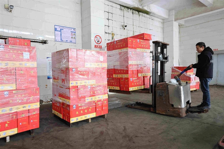 本报讯 2月7日,在位于永宁的石狮正源水产科技开发有限公司,工人们正在把海鲜等冻品大礼盒从冻库中运出来,装车发货,运往全国各地的交易市场。据工作人员介绍,随着春节的临近,这几天海鲜的交易价格比小年前略微上涨,但是订单不减反增,很多市民把海鲜当成走亲访友送礼的佳品。每年春节前一两天,石狮各海鲜市场和海鲜冻库都是交易火爆,进入销售旺季,订单激增。工人们加班加点,“开足马力”满足客户的需求。