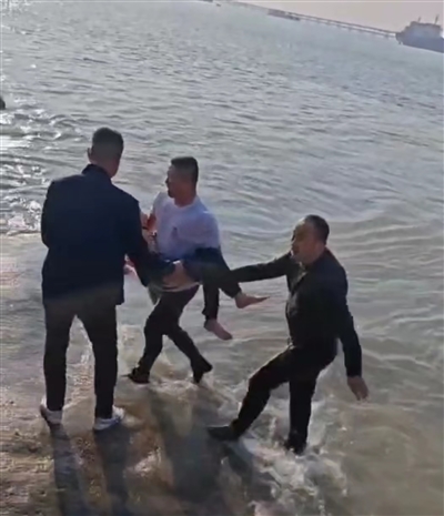 本报讯 2月14日大年初五下午3点多,蚶江镇石湖林銮渡海域发生感人一幕:一名小男孩在林銮渡海域的岸边游玩时不慎落入海里,情况紧急。石渔村海泳爱好者郭华宗、郭前进闻讯后,第一时间赶到小孩落水海域,连衣服都来不及脱便先后纵身一跃跳入海水中,游向这名落水小孩身边,合力将落水小孩救上岸。