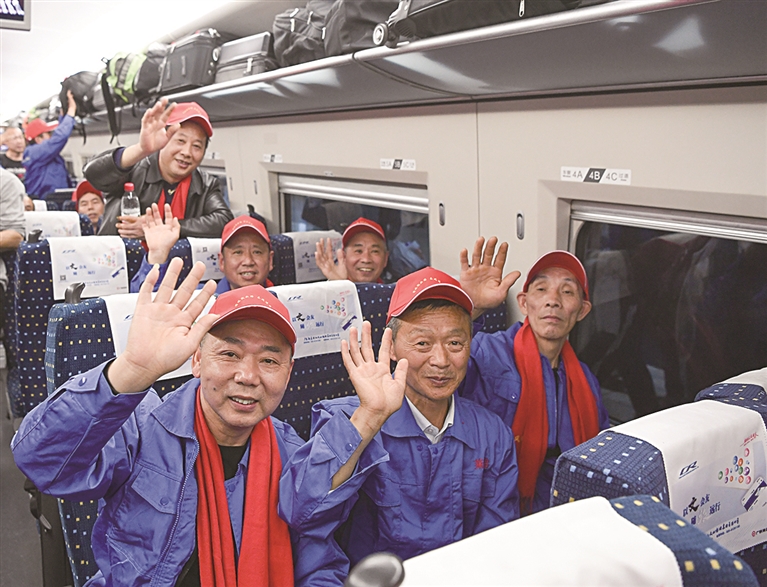 2月19日,在重庆西站,乘坐返岗务工专列的旅客在出发前挥手致意。当日,来自川渝两地的300多名务工人员乘坐由重庆西开往广州南的G3729次列车,踏上返岗之路。这是春节后从重庆开行的首趟返岗务工专列,助力务工人员顺利返岗和企业复工复产。(新华)