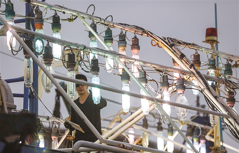 本报讯 虽然还未过正月十五,但祥芝国家中心渔港已经热闹起来,不少渔民开始忙着检修渔船,为出海作业做准备工作,期待年后的第一网能有好的收成。2月21日,记者在渔港看到,在一艘灯光诱捕渔船上,渔民正在检查登记坏掉的灯具,并对其进行更换。(记者 颜华杰)