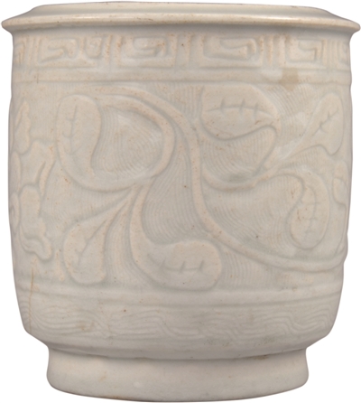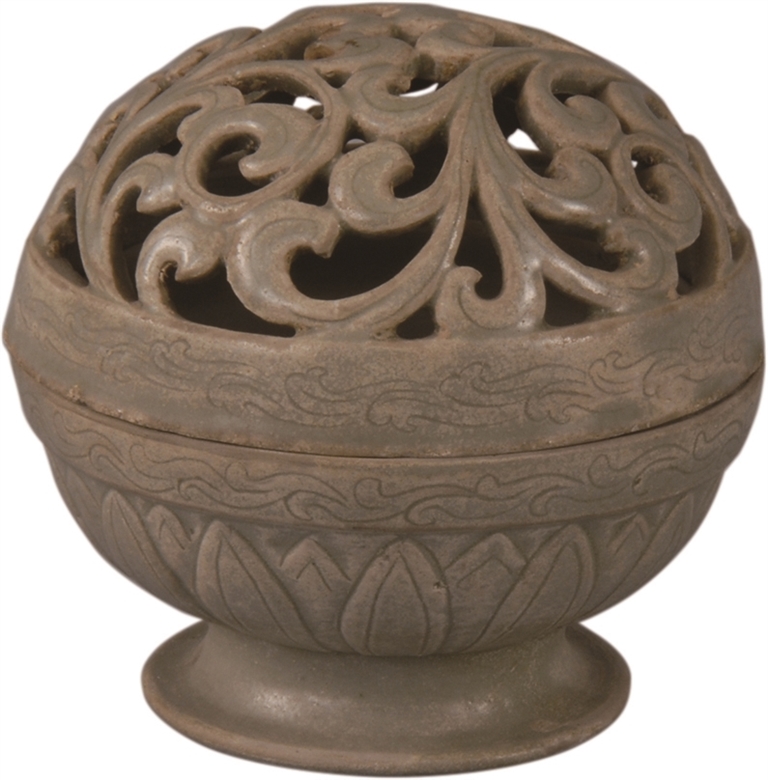 展出的五代—北宋时期的越窑青釉刻花卷草纹镂空香薰为国家一级文物。中国香事传统由来已久,到了宋代香文化发展达到一个高潮,焚香是宋代四雅之一,香薰则是古代的焚香用具。此器通高8厘米,造型精巧、釉色纯净。全器以盖与座两部分相合成扁圆球形,子母口相扣,大圈足,足底微凸,足跟外撇。盒盖镂刻卷草纹,茎叶之外皆镂空,使实用与装饰浑然一体。将所燃香料放置于炉内,香烟可从镂孔处飘出。该器造型典雅规整、纹饰清晰,集镂、刻、印三种手法于一身,代表了越窑青瓷工艺高峰时期的水平,既是精美的陈设品,又是实用品。