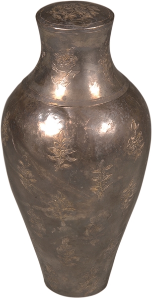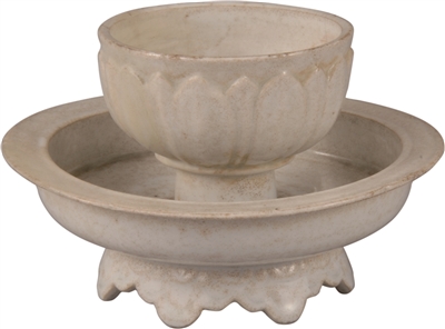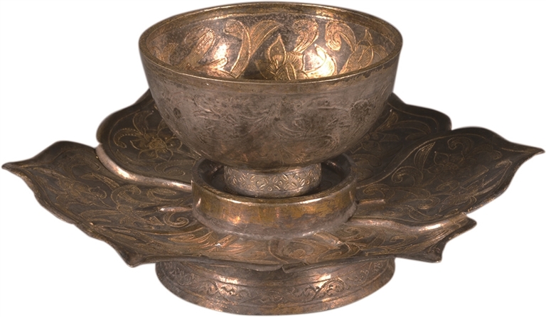 展出的另一件南宋银鎏金水仙花台盏,出土于常州市天宁区周塘桥南宋纪年墓,是一副酒具。酒与宋人的生活息息相关,文人墨客爱饮酒赋诗,江湖侠客喜以酒会客,士大夫则以酒待客。而酒具是用来盛装美酒的,同时也会影响饮酒者的情绪,类似于我们今天所说的“仪式感”。“台盏”是酒盏和酒台子的合称,是酒器中的一种固定组合。因宋代的酒都为发酵酒,直接饮用易造成身体不适,所以需要预先加热。盏壁烫手,故用酒台子承托。酒台子盘心凸起为承台,酒台六出水仙花形,花瓣中心凸起浅台,用以放置酒盏。整个台盏就像盛开的单瓣水仙花。南宋杨万里《千叶水仙花》诗前小序如是云:“世以水仙为金盏银台,盖单叶者,其中真有一酒盏,深黄而金色。”这一形容甚是传神。这套台盏除了形制美观外,杯盏及酒台周身錾刻装饰缠枝花或折枝花纹,远观清雅,近观雍容。盏底錾刻四字“周五二郎”,应为制作该件器物的店家字号。