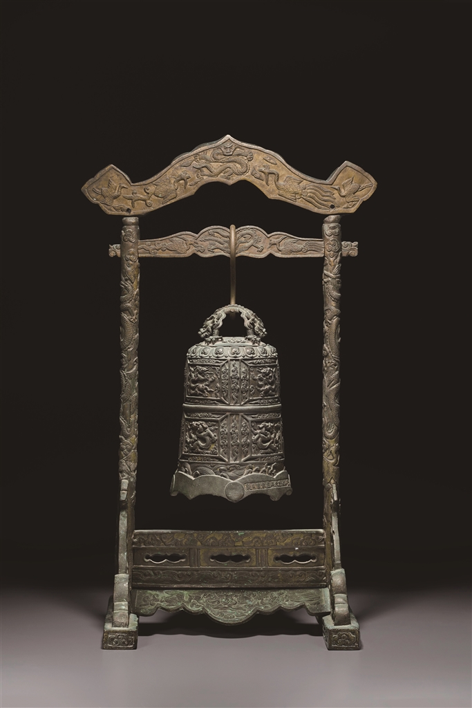 铜双龙钮钟(图1)为明弘治“大明弘治己未年孟春吉日制”铸款,钟座为明嘉靖“大明嘉靖年造”铸款。钟顶端圆弧近平,腹部以一道弦纹分为上下两部分,四方形开光内亦铸云龙纹。龙的造型沿袭永乐时期张口吐舌、鳞片饱满的造型特点,印证明代以五爪龙纹为主的形态,延续至清代。双龙钮,两龙瘦劲遒奇,躬背成拱形,龙身的鳞片纹层次分明。龙生九子,蒲牢为龙四子,张衡《西京赋·注》中记载:“性好鸣,凡钟欲令声大者,故作蒲牢于上,铸为钟钮。”钟下方饰一周海水纹,底部为圆圈状“音枚”。