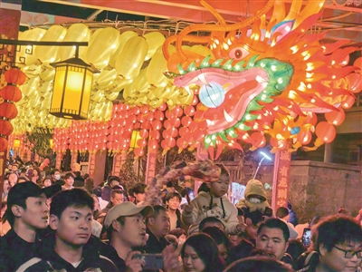 记者看到,元宵期间,永宁古卫城处处都用古典的红灯笼来装饰,节日氛围浓郁。特别是位于小东门处的百米龙灯造型花灯长廊,巨型龙灯让游客流连忘返,沉浸式体验闽南传统花灯技艺。