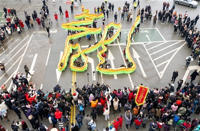2月24日,市民和游客在张家界市永定区观看舞龙表演(无人机照片)。2月24日是元宵佳节。连日来,各地群众在热闹红火的氛围中欢度佳节。(新华)