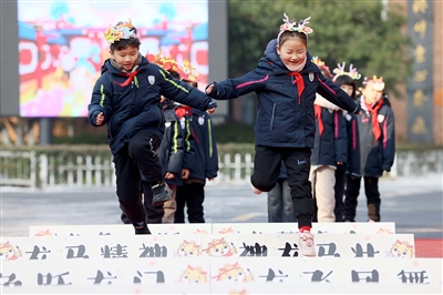 2月25日,在安徽省合肥市和平小学东校,孩子们佩戴龙年卡通头饰参加校园趣味运动,迎接新学期的到来。近日,全国多地学校学生返校报到,迎来春季开学。(新华)