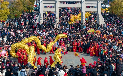 2月25日,人们在全椒县太平文化广场观看舞龙表演(无人机照片)。当日是农历正月十六,安徽省滁州市全椒县传统民俗活动“走太平”拉开帷幕,巡游队伍穿过太平桥,献上精彩纷呈的民俗表演。(新华)
