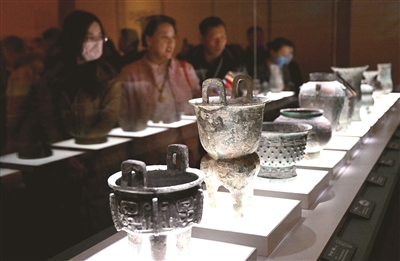 2月26日,参观者在河南安阳殷墟博物馆新馆内观看展品。2月26日,位于河南省安阳市的殷墟博物馆新馆正式开馆,这是首个全景式展现商文明的国家重大专题博物馆。殷墟博物馆新馆坐落于安阳市洹河北岸,与殷墟宫殿宗庙遗址隔河相望,展厅面积约2.2万平方米,展出青铜器、陶器、玉器、甲骨等文物近4000件套。其中,四分之三以上的珍贵文物首次亮相,一系列考古新成果首次展示。(新华)