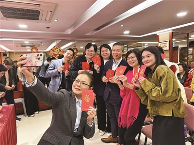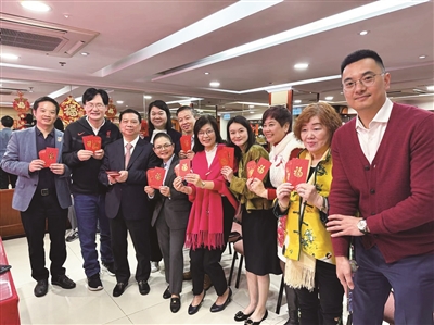 现场,林佑碧和香港石狮同乡总会的其他领导按惯例向参会的乡亲派发利是,与会者吃糖果、猜灯谜、叙乡谊,不亦乐乎。