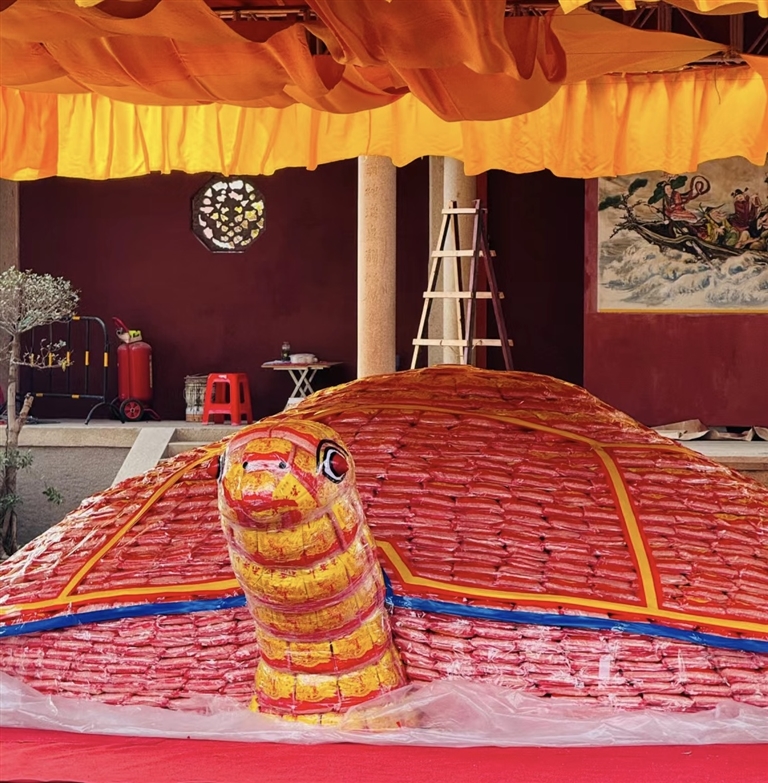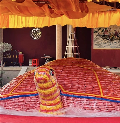 “乞龟”是闽台两地一项古老、传统的民俗文化活动。自2007年起,每年春节期间,泉州、澎湖两地天后宫共同举办泉澎“乞龟”民俗祈福活动,共同祈愿来年幸福安康。在泉州天后宫,今年的这只“米龟”创下历年规模之最,重达5.88万斤,由泉澎两地制龟师傅联手,用一万余袋“平安米”制作而成,周边环绕着由菠萝、香蕉、蒜苗等水果和蔬菜组合而成的“水果龙”,以及象征平安健康的“平安桥”。