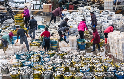 本报讯 正月十五过后,平静了多日的祥芝国家中心渔港又开始热闹起来,渔港内车辆进进出出,到港的渔船正靠在岸边卸货。我市不少渔民节后出海捕捞,目前已有部分渔船回港卸货,新打捞上来的渔产品迅速运往市场进行销售。(记者 颜华杰)