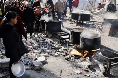2月27日,在加沙地带北部的杰巴利耶难民营,人们等待领取食物。联合国机构官员27日警告,巴勒斯坦加沙地带目前至少四分之一人口濒临饥荒,若不及时采取相应行动,大范围饥荒“几乎不可避免”。(新华)