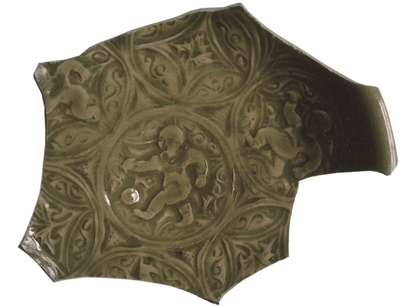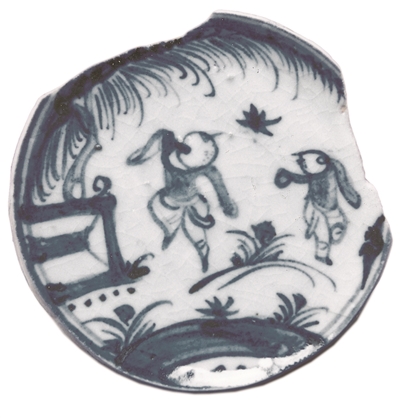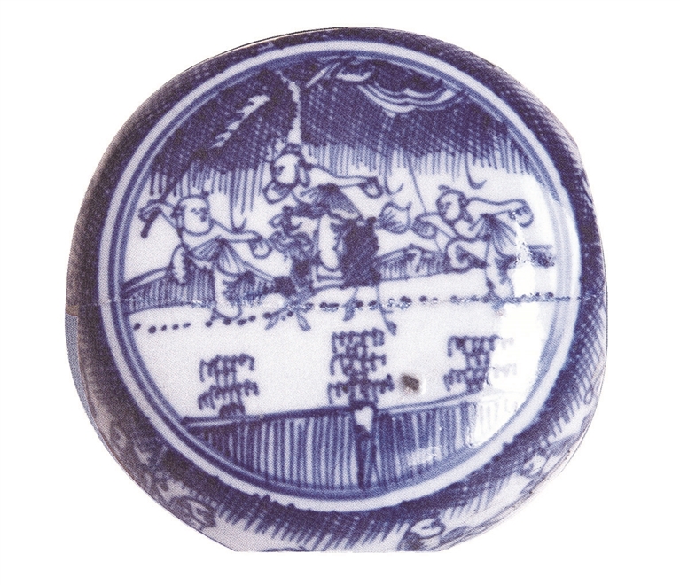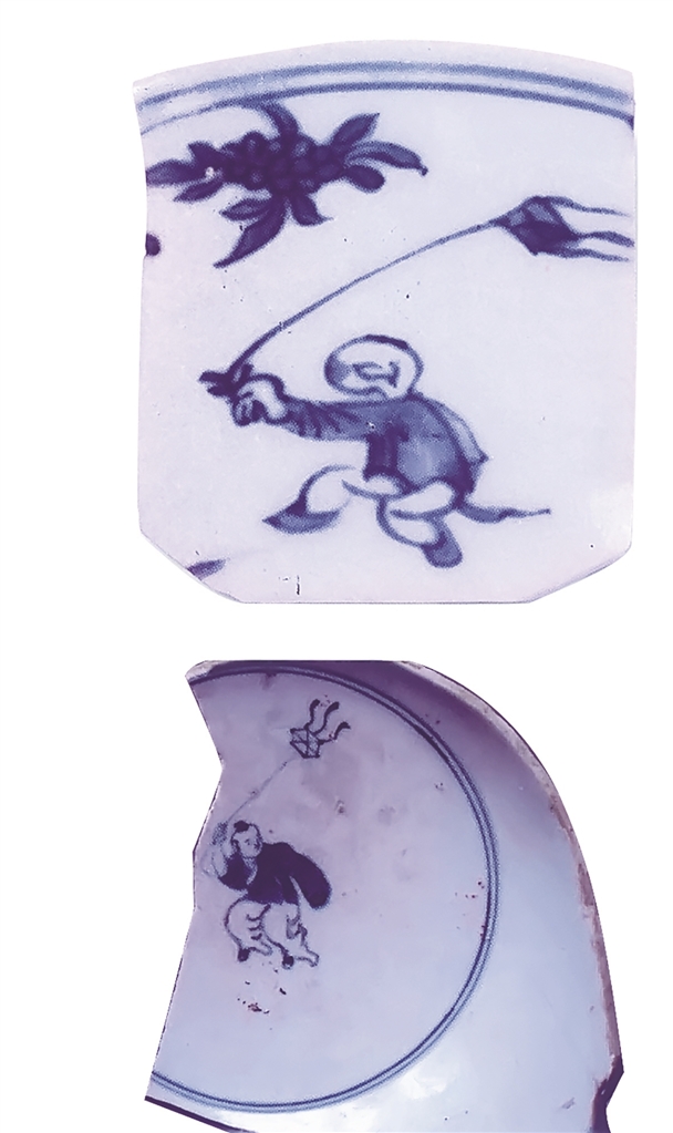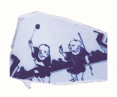 有一片系明代崇祯年的碗底。上绘一童子既非踢球又非踢毽子,而像在模仿某种动物的形态。东汉著名医学家华佗认为,人体要保持健康就得运动。动摇,则饮食得消化,血脉得流通。他以导引法为基础创编的“五禽戏”就是模仿熊、猿、虎等五种动物的运动,以求强身健体。图中人可能是在习练“五禽戏”或太极拳。