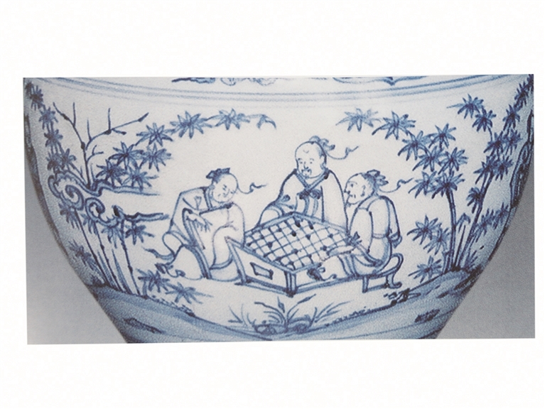 明清两代,棋艺水平得到了迅速提高。明清的青花瓷画上大量出现弈棋图,应该都是现实生活的写照。图3是弘治年的高士弈棋图,二人对弈,还有一老者观棋不语,看来这一局杀得难分难解。