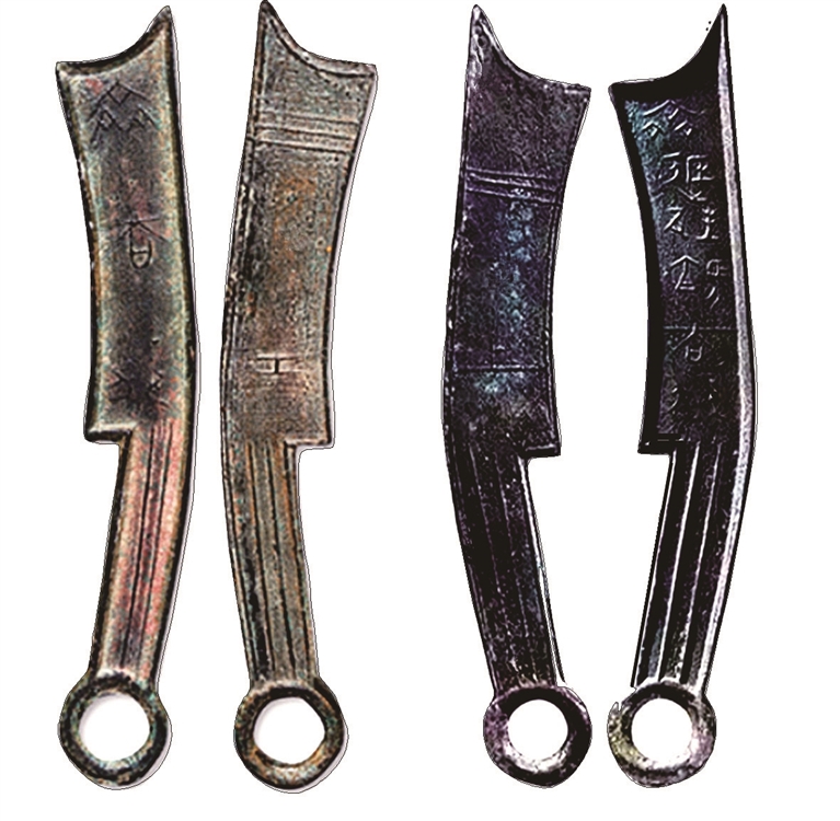 正如前面所述,市场上最常见的改刻方法是把三字刀改刻成六字刀。这是因为:一方面三字刀发现数量很多,价格低廉;另一方面,三字刀与六字刀的形态相似。由于保留了两个原字,必然造成后刻的文字与原字的书体风格不一致。其二由于保留了首尾两字而在刀身中部刻出四字,这样势必造成中间略低于两头,呈凹陷状。为了防止暴露上述缺点,也有人在伪造时将所有的币纹铲去,全部改刻后做旧。这种伪品,虽避免了中间凹陷和币纹风格不协调的毛病,但仍在锈色、文字等方面留下痕迹,如锈色不一、文字不符合战国时的书体风格等(图4)。
