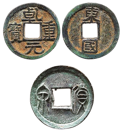 掌握古钱币的时代特征和个别特征是鉴定古钱币的基本依据。古钱币的重要特征包括钱文与形制两个方面。古钱的文字简称钱文,钱文的书体有篆、隶、草、行、瘦金及宋体等多种。即使是同一书体,其笔画也有顿挫转折的变化,丰腴劲瘦的不同。所谓形制,即方孔圆钱有的有轮有廓,有的有轮无廓,也有的轮廓全无(如半两等);它们的穿孔有大小,钱肉有薄厚,轮廓有宽狭,又有重轮重廓(如图5乾元重宝等)及背星、月等多名目;钱文有直读、旋读(即环读)及传形(即文字左右易位)的不同;铜质有青铜、黄铜、红铜、白铜等的差别;其铸造工艺则随着时间、地点、条件的不同而发生变化。