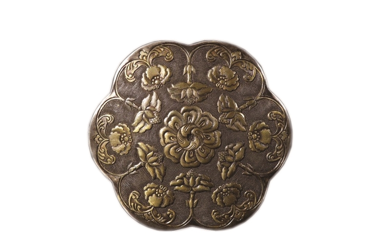 图2所示是一套晚清银錾刻花卉纹攒盒,直径约10、高约3厘米,重约250克。攒盒呈六瓣花形,盒内对应花瓣分为6格。攒盒使用纯银制作,盒面錾刻鱼子纹锦地,其上浮雕花卉纹装饰,花卉鎏金点缀。整器刀法快利,巧夺天工。虽然比不上宫廷造办处的华美富贵,却也是民间艺人的匠心之作。