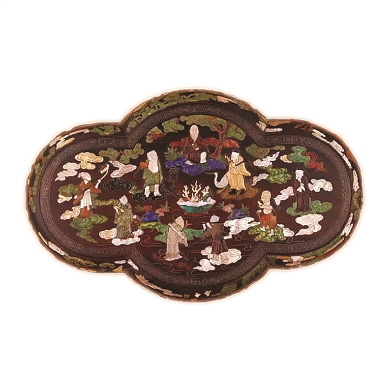图1所示是北京故宫博物院收藏的一套紫檀木百宝嵌八仙图海棠式攒盒,盒高9、长35.5、宽22.5厘米,盖与盒均制成倭角海棠花式,下承海棠花式矮足,采用金银错、镶嵌拼接等多种技巧,用黄、白色螺钿及各种宝石将攒盒装饰得异常精美。盖面嵌“八仙祝寿”图,形象精细,景致疏朗。在盒壁上,用黄色螺钿嵌行龙、白色螺钿嵌浮云和火珠。盒内配装5个错金勾莲花纹的银制攒盘。这件作品为清宫遗存旧物,工精纹细,所用镶嵌材料十分昂贵。这些光彩夺目的嵌饰在深沉的紫檀木色的衬托下显得格外华贵。