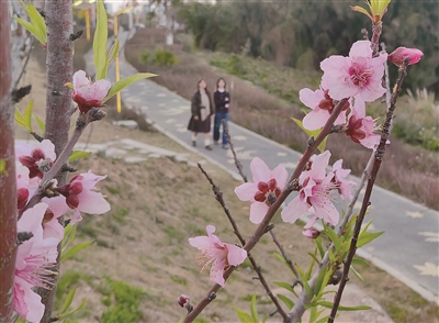 本报讯 春节过后,我市公园里盛开的鲜花争奇斗艳,处处洋溢着春的气息。近日,记者在学府公园塔山水库附近看到,粉嫩的桃花娇艳绽放,开满枝头,醉人的场景、芳香的气息,吸引游人驻足观赏。(记者 王国良 郭雅霞)