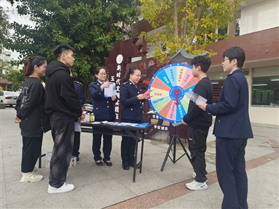 在玉湖社区,“税务蓝”们和社区党员志愿者、新湖小学同学们一起瞻仰雷锋塑像并进行献花仪式。仪式后志愿者们一起开展垃圾不落地文明捡拾活动。随后,青年税宣志愿队开展税宣志愿活动。通过政策指导、发放宣传单等方式开展个税、居民社保医保缴费等相关事项宣传。现场还设立税收知识大转盘,转盘上包含增值税、消费税、个税等常见税费总类,分别对应相关税费在生活中常见问答题目,参与答题可获得税费知识手册和小礼品。税务志愿者带小朋友识读转盘上的税费种类,还根据居民的答题情况进行深入讲解,帮助社区居民更全面掌握税费知识。