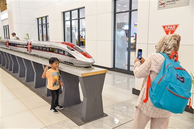 3月3日,在印度尼西亚雅加达哈利姆站候车大厅,一名小朋友和雅万高铁高速动车组模型合影。 记者从中国铁路国际有限公司获悉,雅万高铁3日发送旅客17289人次,自开通运营以来累计发送旅客突破200万人次,客流持续保持高位态势。 (新华)