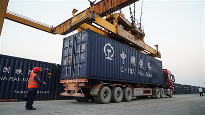 在南宁国际铁路港,塔吊将集装箱从汽车吊运到火车上(3月4日摄)。春运期间,中国铁路南宁局集团有限公司采取优先编组、优先挂运、优先对位等措施,积极开行西部陆海新通道铁海联运班列,保障春运物资发运,助力国内国际双循环。据中国铁路南宁局集团有限公司统计,2024年1月26日至3月5日,西部陆海新通道铁海联运班列发送货物7.7万标箱,同比增长4%。(新华)