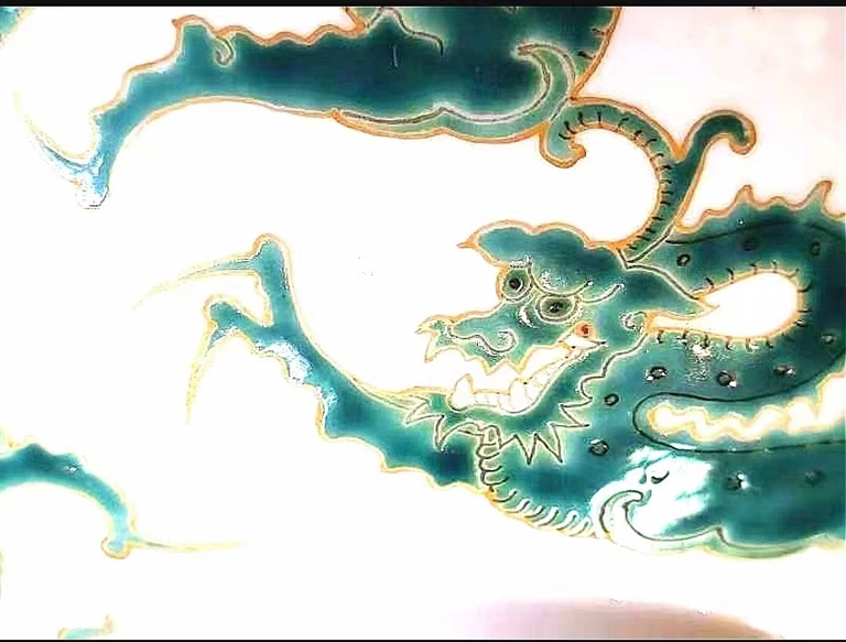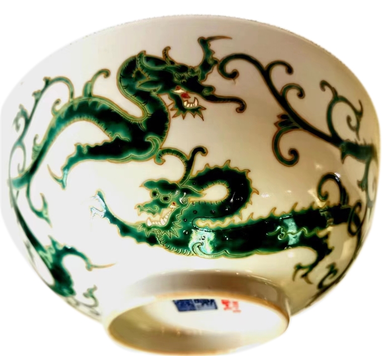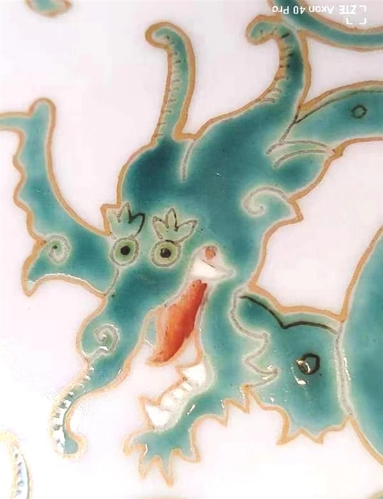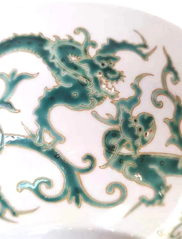 丁先生小心翼翼地从一个锦盒中捧出一只白地绿彩大碗,隔着书桌便看到这只碗非凡大气。碗上绘了七条绿彩香草龙,其中两条龙足上画二爪,另五条龙足上画的是一爪。轮廓线皆用金彩描绘,金碧辉煌,显示出皇家气象。再仔细观察,惊奇地发现,五条一爪龙中四条龙口中描有红彩舌头,一条龙的口舌为头上的披发掩盖。另两条二爪龙口中则未绘红舌。几个人一边上手察看描金绿彩龙碗,一边进行研讨。为何同为乾隆官窑器,在同一件碗上绘制同样的香草龙,而龙爪却有一爪和两爪的区分?这又出了一个新的难题。大家认为新发现的绿彩龙碗上的龙纹饰,肯定有一定寓意,但一时还真想不出有何寓意。
