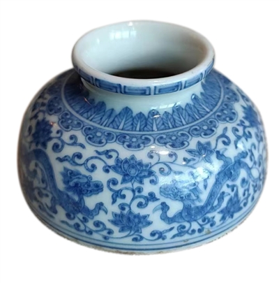 笔者综合新的资讯进行研究,竟然很难深入下去,似乎有了山穷水尽的感觉。尽管收藏圈里有不成文的俗定,叫“藏品不问出处”,但笔者还是禁不住有了要刨根问底的冲动。笔者顾不得朋友的忌讳,为了求索真理,还是忍不住写信,向青花水盂一爪龙的藏家丁先生发出询问:该水盂如何得来,何处得来?丁先生十分爽快,也希望早日研究出答案。他经过反复回忆说:“这件清乾隆青花一爪龙水盂还是二十多年前在北方某地工作时淘到的。当年工作之余,喜欢收藏文玩,所以曾结交了当地一些收藏家朋友。印象中这个人出自书香世家,依稀记得当时还有几件瓷器一起转让给了我。这件水盂当时他好像特别强调是件好东西。当然,我不会轻信他的描述,但仔细观察后这件东西确实很美,温文尔雅,有书卷气,就收藏在家。一藏就是几十年,也不在意。等我再找找看当年收来的其他瓷器。”