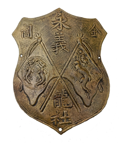 苏州历史上民间的消防组织称为龙社,又名水龙会、水龙救火社和水龙公所,因为当时救火所用的主要工具是水龙而得名。龙社的大量出现是在清末,其创办者多为热心公益的商人。龙社与当时的会馆、公所、市民公社等社会团体关系密切,社址大多借用善局善堂、寺庙宫观等慈善宗教设施,这与救火属公益善举有很大关系。清末金阊(今苏州)永义龙社证章,盾牌造型,符合消防救火的主题,左边绘有大清国旗,右边绘有双龙戏珠龙旗,估计为永义龙社社旗,名称与龙旗,相得益彰。图13为金阊永义龙社证章。