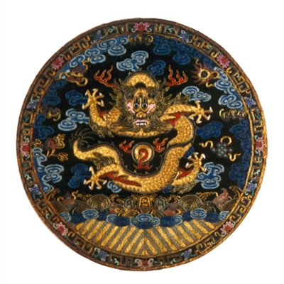 补子亦称“胸背”“官补”,是明清时期官服前胸或后背帖缀的尺寸30至40厘米的圆形或方形织物。官位不同纹样亦不同,文官补子图案用飞禽,武将补子用走兽,而皇亲国戚则绣蟒(龙)纹,作为身份、等级、地位的标志。图6为清朝亲王、亲王世子朝服的团蟒补子。