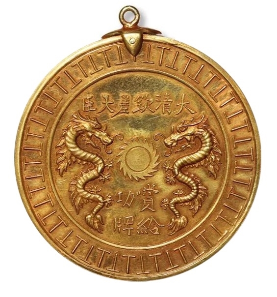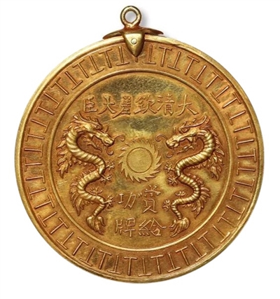 “丹书铁券”是指古代帝王颁授给功臣、重臣的一种特权凭证, 俗称“免死金牌”,最早始于汉高祖刘邦,堪称中国古代最早的勋章,在明代尤为盛行。满清入主中原改朝换代后,废除“丹书铁券”制度,用“功牌”取代,由总督、巡抚、统兵等高级官员用以颁赐有功部属,基本具备现代奖章、勋章的诸多要素。功牌多为纸质,也见有金、银、铜制作,功牌上常镌(印)龙纹。