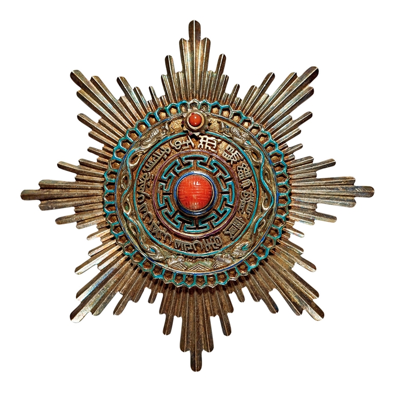 清光绪七年十二月十九日(1882年2月7日),诞生了中国历史上第一枚真正意义的勋章——御赐双龙宝星,以“表德彰誉,率世历俗”,开创中国勋章制度先河。该勋章设计中西结合,外形为星状,图案仿照大清国旗,以龙为标志,共分五等十一级,第一、二、三等各分三级,第四、五等不细分级,等级用满文标于宝星之上,并镶嵌珍珠、珊瑚、宝石等,以颜色区分等次。授予勋章的同时发给“勋章证明”,以资佐证。《宝星章程》对勋章颁赠对象、佩挂所用绶带都有明确规定。起初仅颁赠外国使节,或作为外交礼品,直到光绪三十四年(1908)才经外务部奏准,亦可颁发给本国外务部官员及出洋使节。