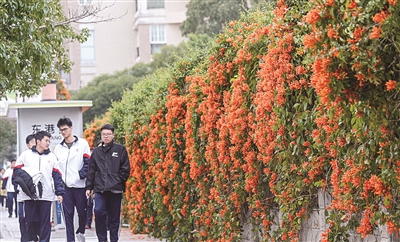 近日,记者来到石光中学,发现这里的炮仗花爬满围墙栏杆,如瀑布般倾泻而下,形成“热闹”的炮仗花花海。我市一些地方都有种植炮仗花,目前正是炮仗花的最佳观赏期。(记者 颜华杰)