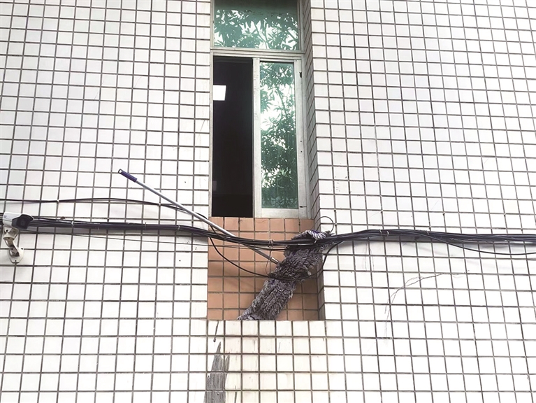 近日,笔者发现利用垂下来的电线晾衣服、晾拖把的人不在少数。笔者在濠江路看到,有市民将滴水的拖把挂在电线上,电线成了“拖把架”,看上去十分危险。“把电线当成晾晒拖把的地方,这种行为太不文明了。如果电线上带电,那多危险啊。”从此经过的市民王先生表示这样的做法既影响市容市貌,又存在安全隐患。利用电线随意晾晒的行为方便了自己却给城市市容以及周边居民带来了负面影响。(张诗瑶)